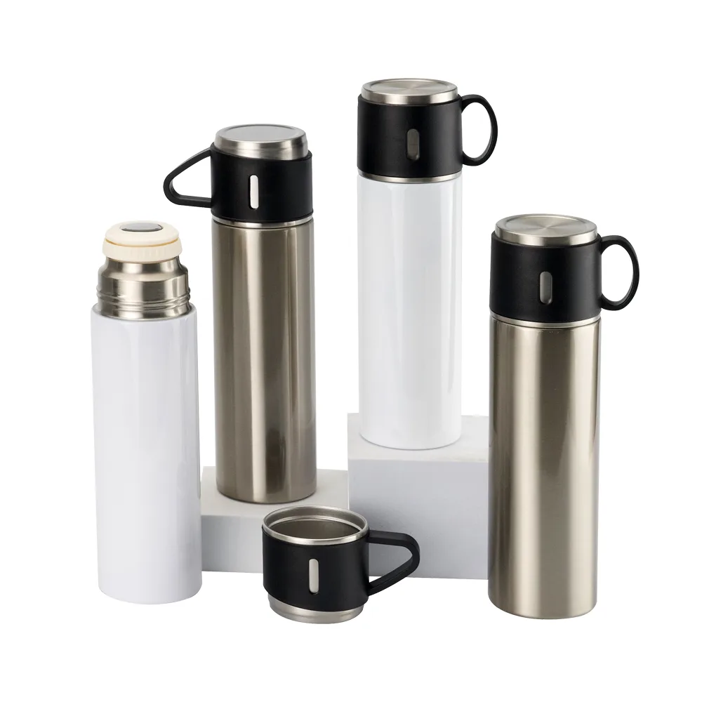 Meet the 500ml Sublimation Vacuum Insulated Sports Bottle. Its innovative lid converts into a cup and features a snap-seal button. With double-wall insulation, it keeps drinks hot or cold for hours. Carabiner-compatible for easy carrying. Personalize it with our high-quality ORCA Coating.